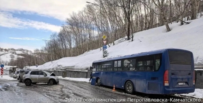 В Петропавловске-Камчатском утренний гололед спровоцировал серьезную аварию. Легковой автомобиль протаранил пассажирский автобус после потери управления на проезжей части.