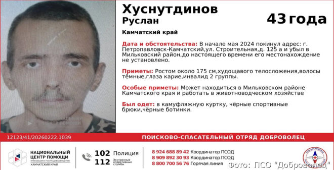 Почти год в поисках: Камчатка вновь подняла тревогу из-за исчезновения 43-летнего Руслана Хуснутдинова. В начале мая 2024 года он покинул свою квартиру в Петропавловске-Камчатском и направился в сторону Мильковского района, после чего как сквозь землю провалился. Приметы весьма характерные: рост 175 см, худощавое телосложение, тёмные волосы и карие глаза. В день исчезновения на Руслане была камуфляжная куртка и чёрные спортивные брюки. По мнению волонтёров, он может находиться где-то в Мильковском районе, возможно, трудится на местной ферме. Людей просят откликнуться, если есть хоть какая-то информация о местонахождении Руслана.