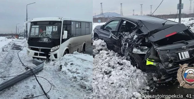 12 марта в Елизове произошло столкновение. Маршрутный автобус, управляемый 56-летним водителем, не справился с управлением и наехал на припаркованную на обочине «Тойоту Королла Филдер». После удара автобус влетел в фонарный столб. В момент аварии в салоне пассажиров не оказалось.