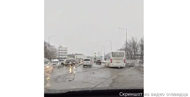 На Камчатку обрушился циклон, и Петропавловск-Камчатский оказалcя под натиском сильного дождя и снега. В результате дороги залиты водой, а некоторые участки подверглись значительным повреждениям.